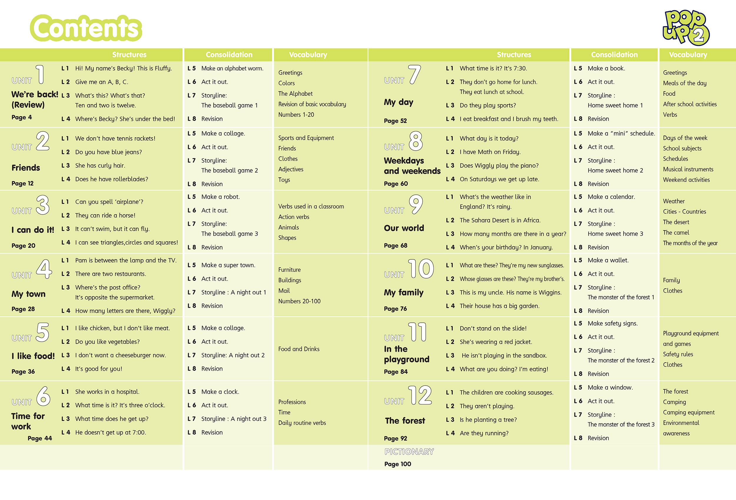 Pop Up is an innovative six-level primary course in American English. It takes students from Beginner to Pre-intermediate level, while carefully considering students’ particular needs and interests at each stage. It is based on the modular approach which enables students to deal with topics in depth. In addition, its multi-dimensional syllabus helps learners to acquire English through an integrated development of the four skills, reading, listening, speaking and writing.